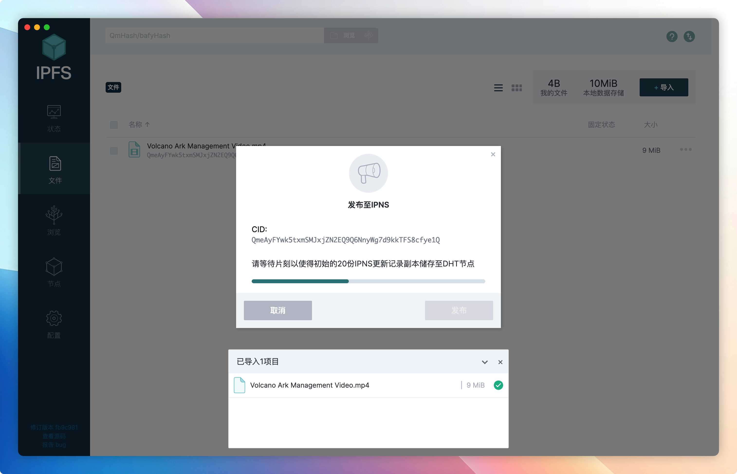 - 拖拽文件上传,获得一个 CID(文件指纹);